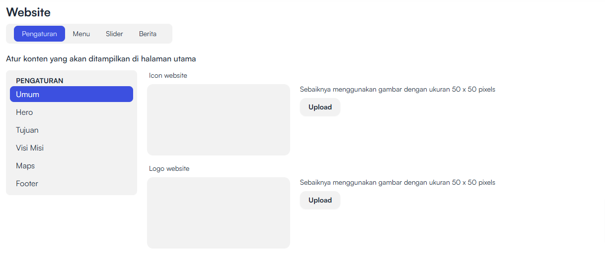 Pada halaman Pengaturan Umum memungkinkan admin untuk mengelola tampilan utama website, termasuk mengunggah ikon dan logo yang akan ditampilkan di seluruh halaman website.